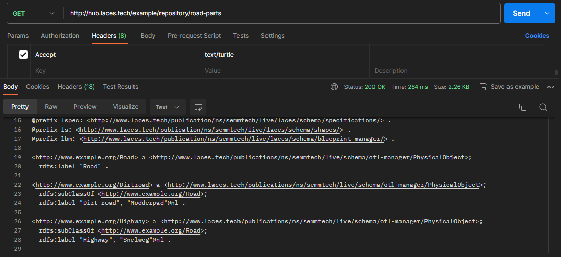 Fill in the URL into the request field in Postman, set the proper authentication (see above) and (optionally) specify the format desired. In case no explicit format is specified Turtle will be used.